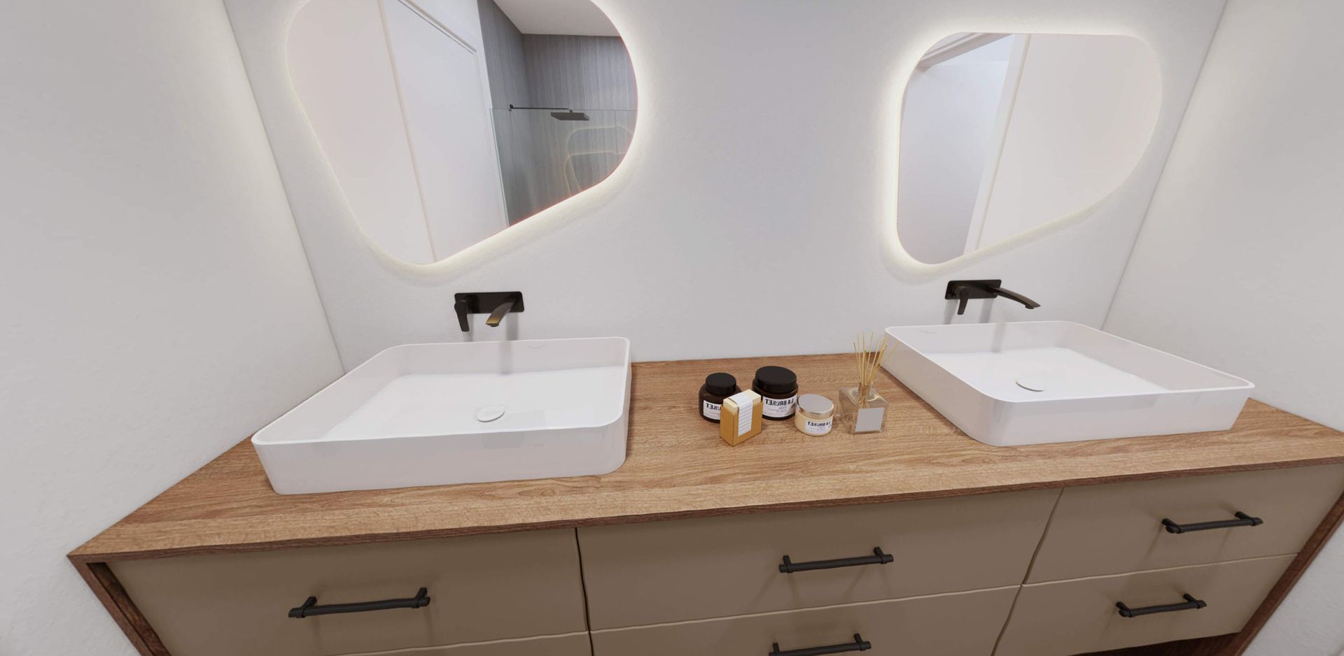 Discover the luxury and style of our new flats with two distinct design packages. Choose the first package for a warm, inviting look with dark brown maple and taupe cabinets, Gold Warm high-gloss countertops, and light winter oak flooring. Alternatively, opt for the modern, bold aesthetic of the second package, featuring natural walnut and iron ore cabinets, Gray-White high-gloss countertops, and rich Hampton Valley Hickory flooring. Both options offer a sophisticated and stylish living space tailored to your taste.